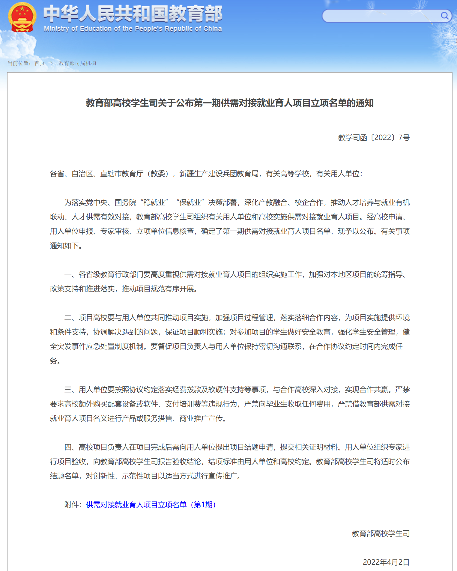 近日,教育部发布《教育部高校学生司关于公布第一期供需对接就业育人项目立项名单的通知》(教学司函〔2022〕7号),U8娱乐