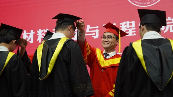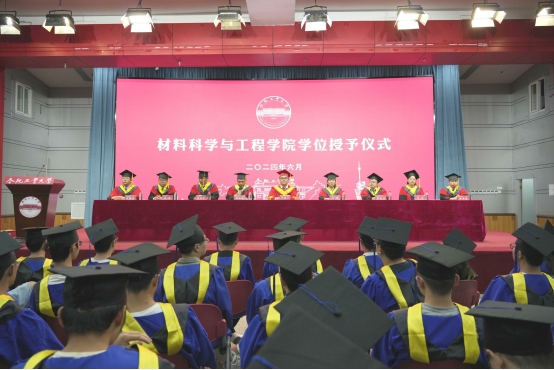 关于授予2024届毕业生学位的决定》,授予材料科学与工程专业刘永超等6名博士研究生博士学位、材料物理与化学专业李华博等168名硕士研究生硕士学位、金属材料工程专业高照等269名本科生学士学位。主席台领导、老师为获得学位的全体学生颁发学位证书、扶正流苏,并与毕业生合影留念。