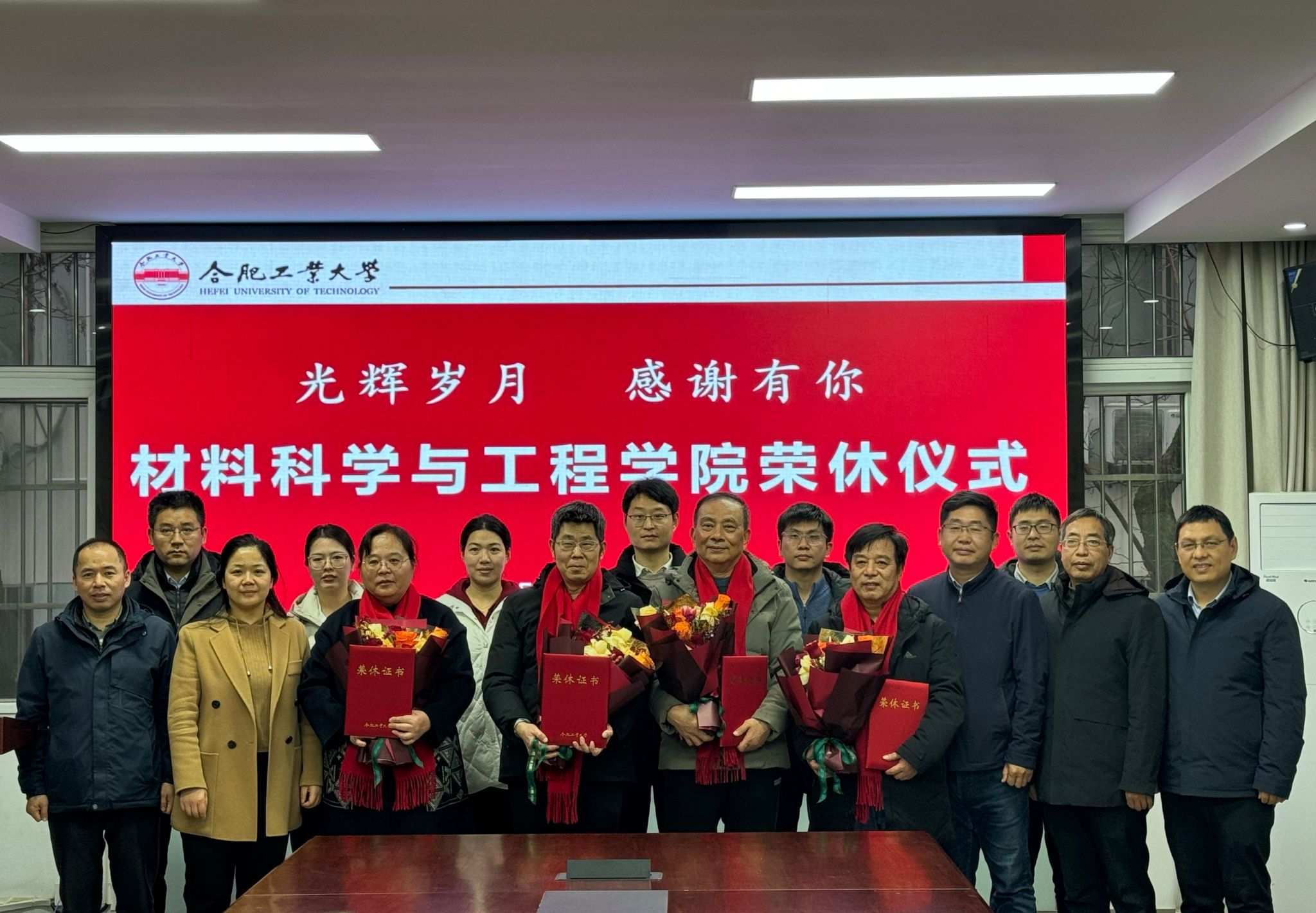 领导为退休教师颁发荣休证书,青年教师代表敬献鲜花,对他们数十载如一日扎根讲台、深耕科研的坚守与付出表达崇高敬意。全体参会人员合影留念。