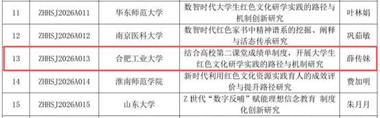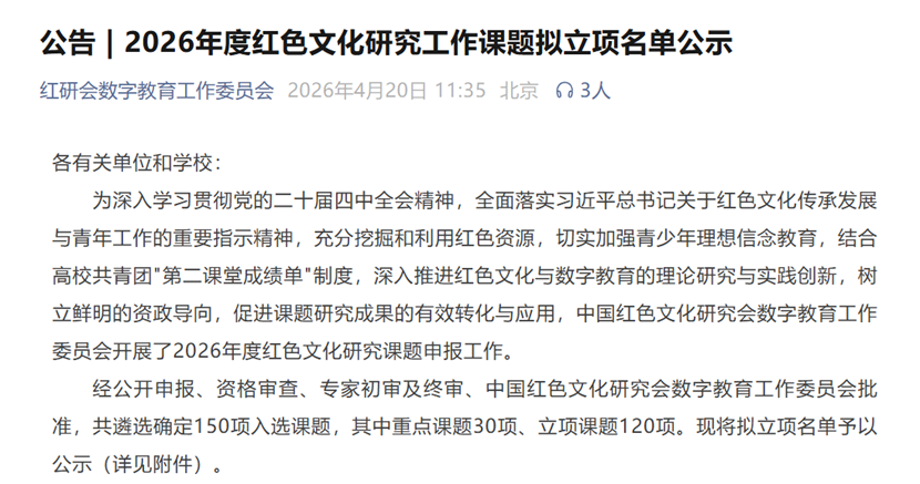 近日,中国红色文化研究会数字教育工作委员会2026年度红色文化研究课题立项结果公布,U8娱乐 辅导员队伍课题《结合高校第二课堂成绩单制度,开展大学生红色文化研学实践的路径与机制研究》获重点课题立项支持。