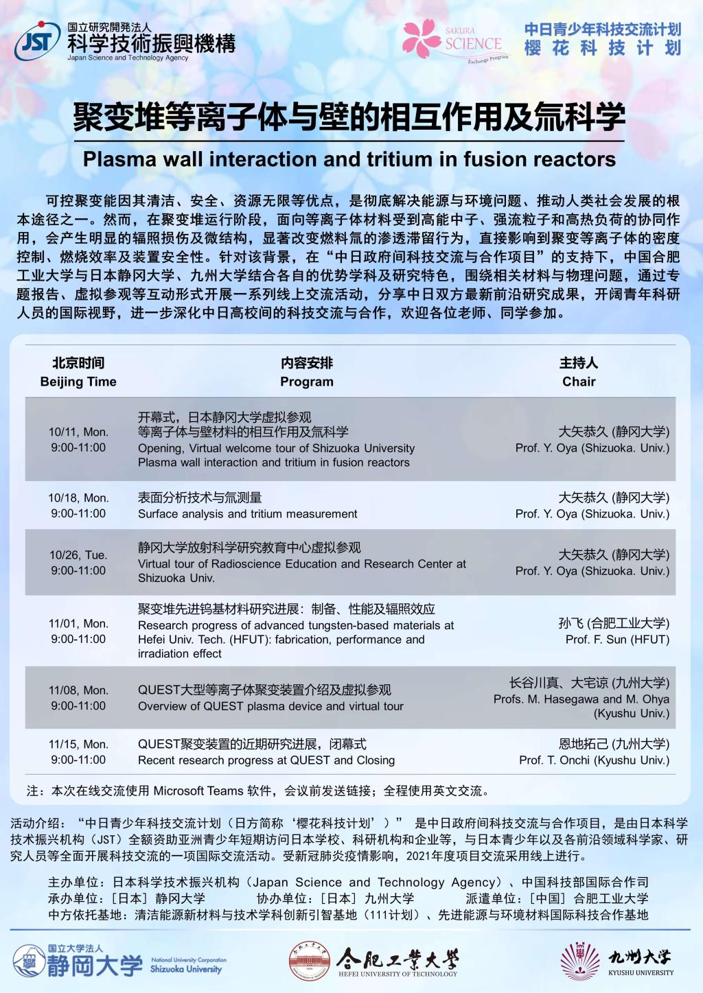 项目以“聚变堆等离子体与壁的相互作用及氚科学”为主题,围绕聚变堆材料与等离子体物理问题,线上实施专题报告、虚拟参观等系列活动,交流中日双方最新前沿研究成果,开阔青年科研人员的国际视野,深化双方高校间的科技交流与合作。