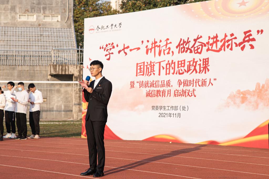 2020-21学年国家奖学金获得者材料成19-2班王国强同学做国旗下的思政课《学习习近平总书记“七一”重要讲话精神,传承红色基因做新时代工大有为青年》主题演讲,王国强同学以习近平总书记在七一讲话中深情寄语新时代的中国青年以“实现中华民族伟大复兴为己任,增强做中国人的志气、骨气、底气,不负时代,不负韶华,不负党和人民的殷切期望”为主题,呼吁全体学子学习专业知识和党史,增强专业本领,努力做社会主义合格建设者和可靠接班人。王国强领誓全体同学“铸就诚信品质,争做时代新人”致U8体育