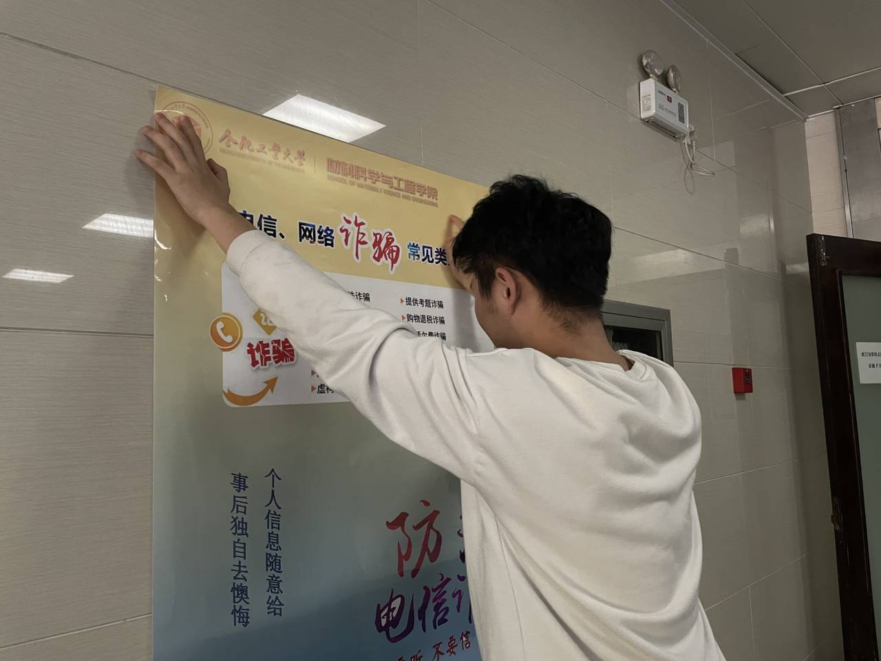将获奖标语制成海报,发动同学们在教学楼醒目处张贴,以加强同学们反诈意识,提高学生各方面自我预防、自我保护、自我应对的能力,从而有效减少诈骗案例的发生。