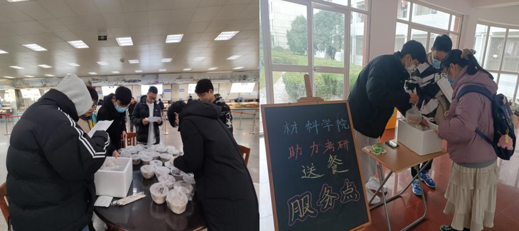设立考研自习室三间,于12月24-27日间为考研学子开放;同时,招募学生党员组建立“助力考研送餐队伍”,提前了解考研学生用餐需求,并为其购买配送至宿舍楼下,极大的节约学生用餐等待时间,令考研学子在考试期间安心考试,有效休息。