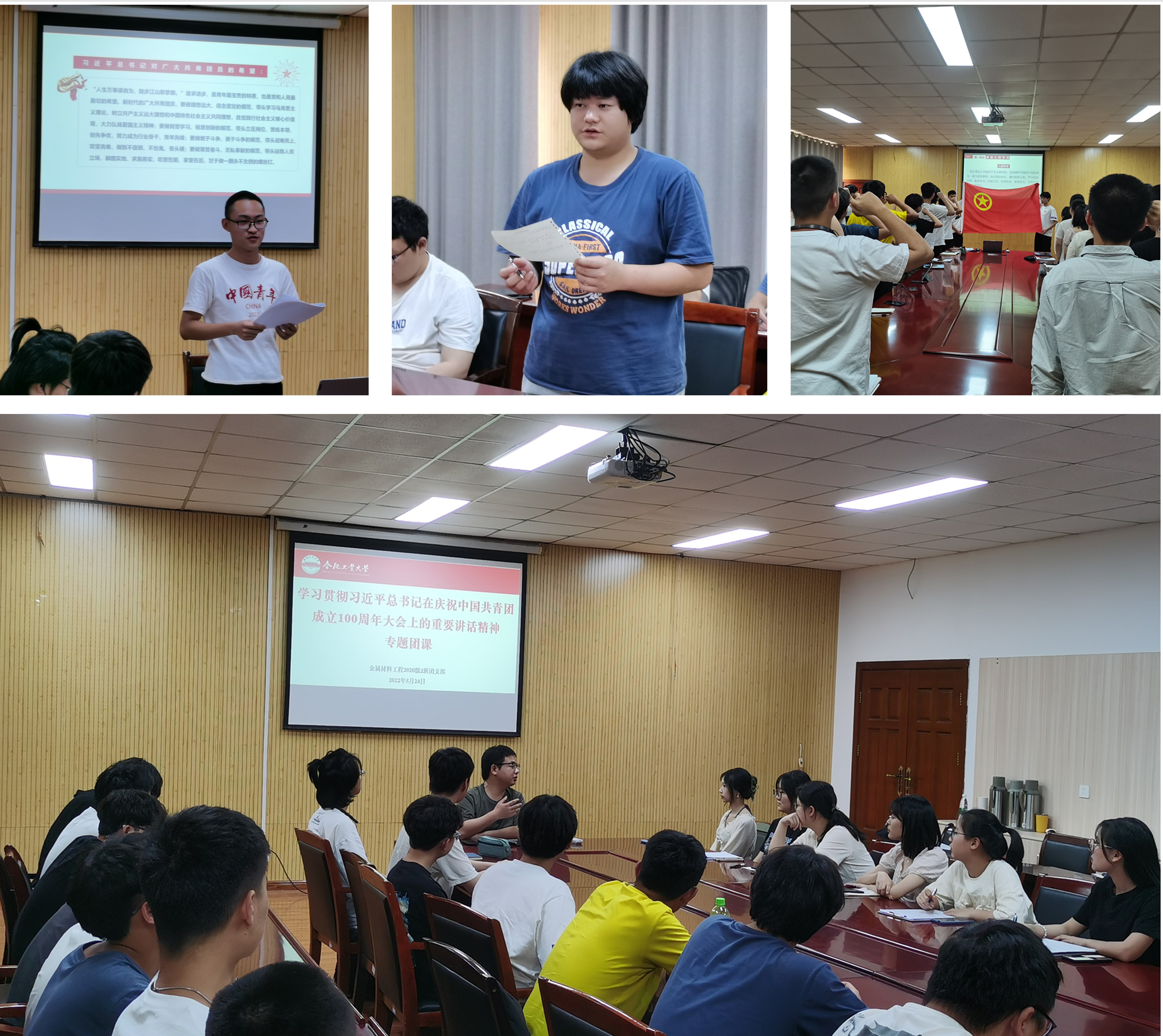 学生工作办公室副主任兼团委副书记马贤峰老师以“不忘初心跟党走,青春建功新时代”为主题,带领全体同学认真学习了习近平总书记在庆祝中国共产主义青年团成立100周年大会上的重要讲话内容,回顾了百年来共青团坚定不移听党话、跟党走的青春历程,引导全体同学坚定在新时代施展抱负、建功立业的信心底气,树立始终做有理想、敢担当、能吃苦、肯奋斗的新时代好青年的奋斗目标。团课结束后,同学们围绕习近平总书记对青年寄语、现阶段的学习生活、疫情防控等话题展开讨论交流。宣贺同学表示:“青年要做崇德向善、严守纪律的模范。作为青年团员,我们要把习近平总书记的亲切关怀和深情勉励转化为投身抗‘疫’斗争的实际行动,自觉遵守学校疫情防控规定,做校园疫情防控的‘守门员’。”最后,全体同学面向团旗庄严宣誓,重温入团誓词,整齐划一的铮铮誓言久久回荡。
