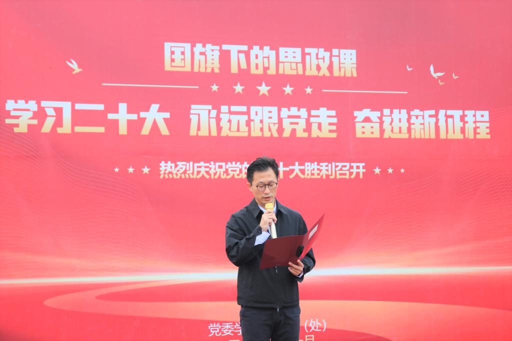 在翡翠湖校区风雨操场开展“学习二十大 永远跟党走 奋进新征程”主题升旗仪式暨国旗下的思政课。党委学生工作部副部长崔健,U8娱乐