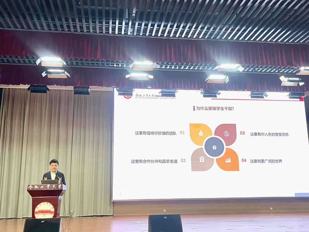 学工办副主任兼团委副书记马贤峰从培训目的、培训对象、培训时间、培训内容和培训形式等方面布置“斛兵材子”第二期学生骨干素质能力提升培训班工作,并对学生骨干提出相应要求。