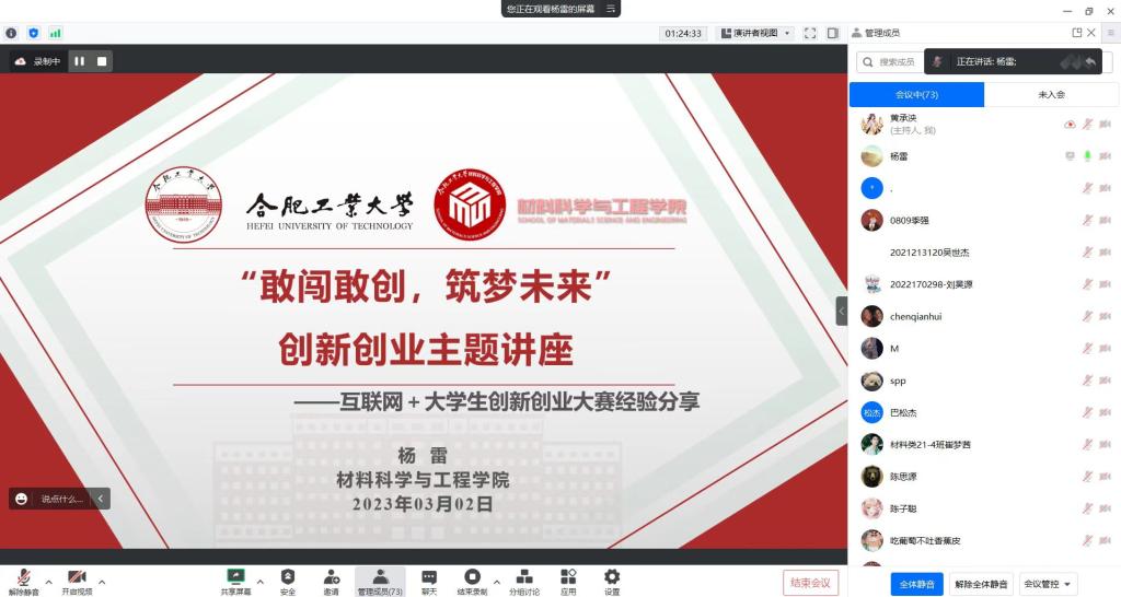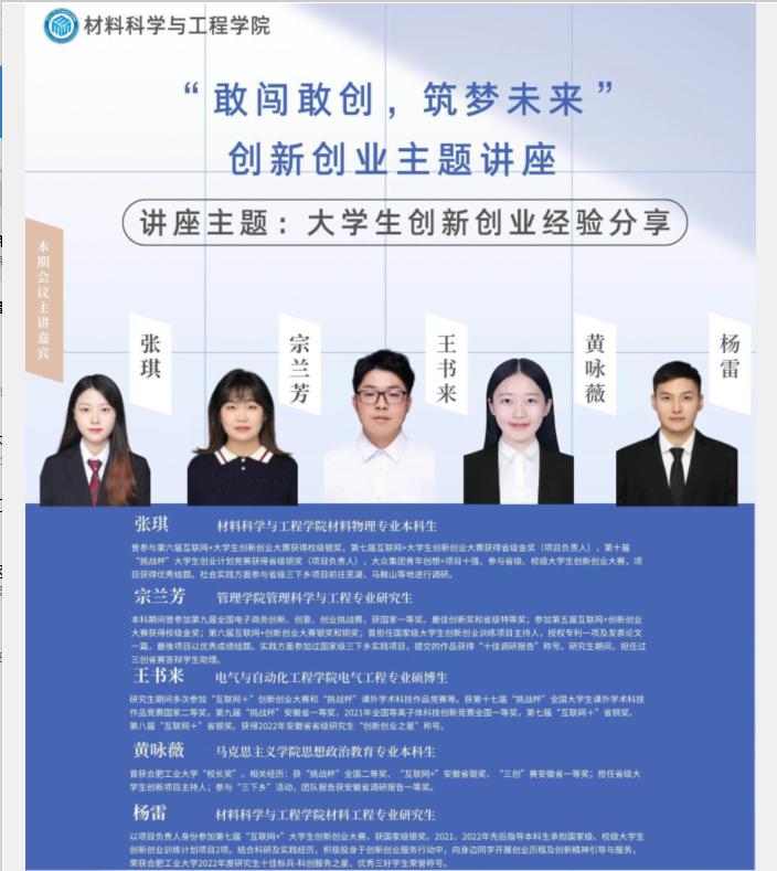 线上成功举办“敢闯敢创,筑梦未来”创新创业主题讲座。本次讲座,共邀请了5名具有丰富创新创业赛事参赛经验的同学担任主讲,同时这5位同学均在不同的赛事中获得了出色的成绩。