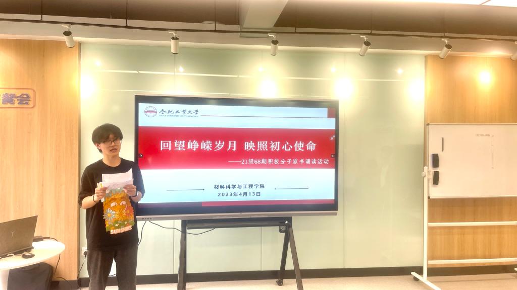 4月13日,U8娱乐 在翡翠湖校区二号学生社区沙龙空间举办“回望峥嵘岁月,映照初心使命”主题家书诵读分享会,2021级第68期发展对象班、积极分子班学员参会。