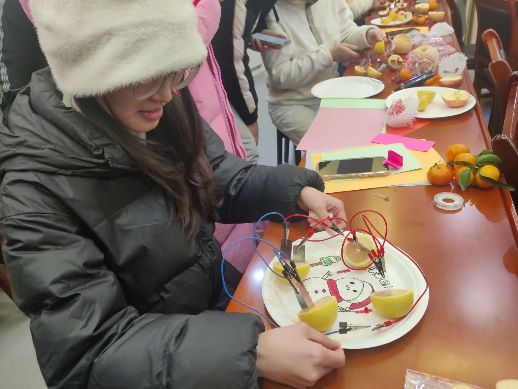 的20余支队伍参加。现场气氛欢快热闹,每支队伍都在构思自己的设计理念和原理,互相阐述着属于自己的理解,从橘子、柠檬、西红柿到梨子,从铜片、铝片、导线到彩纸,水果电池的结构逐渐清晰。在最终展示环节,参赛队伍纷纷阐述了各自电池的设计理念和独特寓意。评委团对每支队伍进行了电池知识的问答,参赛团队在问答中互相学习,共同掌握电池相关知识点,真正实现了实践创新与理论学习的有效结合。