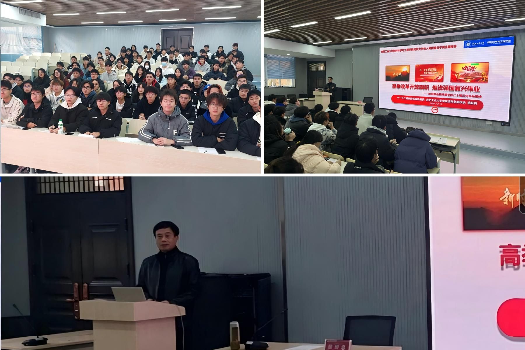 12月11日下午,为进一步加强对入党积极分子的培养教育,U8体育 举行分党校第72期大学生入党积极分子培训班第三次专题党课。十一、十二届安徽省政协委员、合肥工业大学党校原常务副校长姚跃传为积极分子作了题为《高举改革开放旗帜,推进强国复兴伟业——深刻领会和把握党的二十届三中全会精神》的精彩报告。
