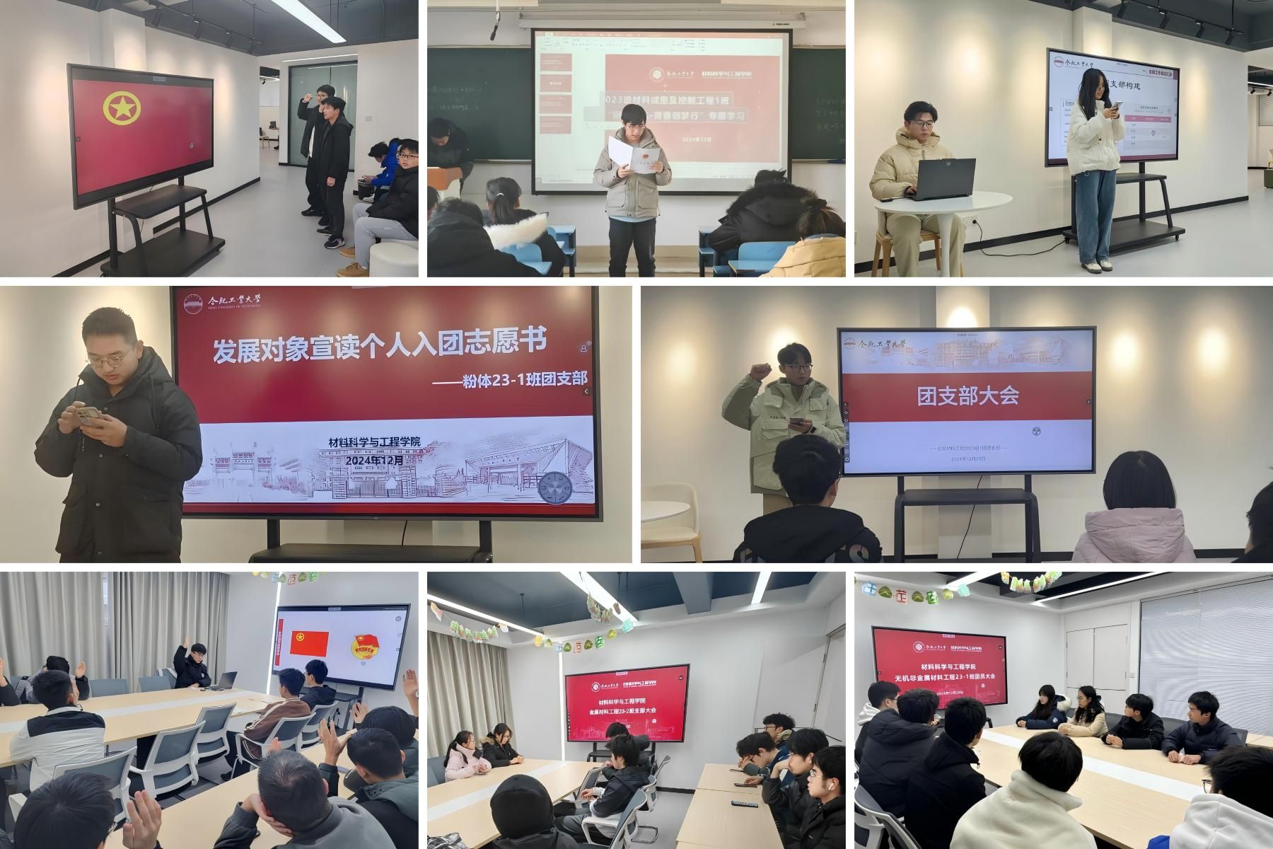 2023级各支部分别召开入团仪式。会议伊始,团支书对本次会议背景和拟发展对象情况进行介绍,紧接着由新发展团员对象汇报对团的认识、入团动机、个人简历及其他需要向团组织说明的问题。发言完毕后,支部全体团员对新发展对象的入团情况进行充分讨论,并采取无记名投票的方式进行表决。经统计,由团支部书记宣读大会表决结果。表决通过后,新入团员进行庄严的入团宣誓。各支部书记为新团员代表颁发团徽、团员证,鲜艳的团徽在新团员的胸口散发出熠熠光芒,提醒着他们时刻牢记团员身份,发挥先锋模范作用。入团仪式在全体成员齐唱中国共产主义青年团团歌《光荣啊,中国共青团》中落下帷幕。