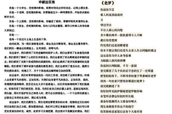 在疫情期间继续推进疫情期间第二课堂建设的系列活动之一。自活动开展以来,深受同学们喜爱与支持,激发同学们主动去思考自己在疫情中扮演的角色,将自己的感受以文字的形式记录下来。同时本次征文活动也体现出了新时代大学生们积极思考、不断探索的精神风貌,激发起了同学们的爱国热情!