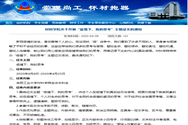 面向全院学生开展了“疫情下,我的思考”主题征文活动,旨在用心凝聚思考,用文字承载感悟。