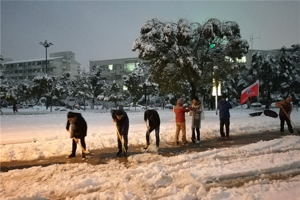 纷纷扬扬的大雪把整个校园装扮得银装素裹,但积雪也使得校园里的道路变得湿滑泥泞,给师生安全出行带来不便和隐患。同学们冒着严寒挥锹铲雪,在漫天飞舞的雪花中,构成了一道别样的风景。铲除冰雪的热情高亢,团结互助的背影最美,路人们纷纷停下脚步,为这扫雪大军“点赞”。经过长达两个多小时的清扫,翡翠湖校区部分主干道的积雪已清理干净,为广大师生的出行提供了方便。