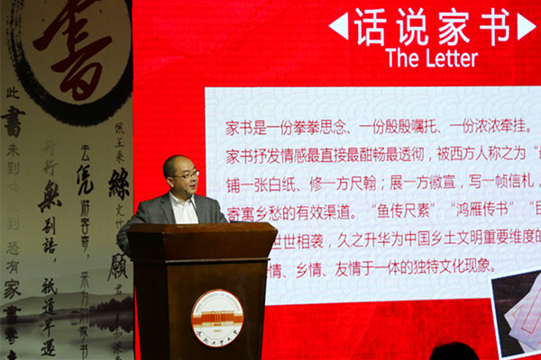副教授钱斌老师对家书文化进行解读。他通过古今通信方式的对比深刻剖析中华家书文化,并深入浅出地为同学们解读中华民族绵延几千年的家书文化。