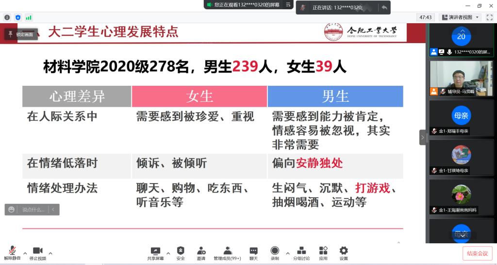 本次讲座由学校心理健康教育与咨询中心骆贵老师主讲。骆贵老师以“关心理解和爱,促进孩子心灵成长”为主题,结合大二年级学生特有心理健康特点,引导学生家长关心学生健康成长。骆老师向家长们重点介绍了倾听、共情理解、民主型教养方式、良好沟通和表达等四种关心孩子心理健康的技巧,以及民主型、专制型、溺爱型和忽视型等四种不同类型的家庭养育方式,并分析了不同养育方式对孩子的人格完善、社交能力、心理健康等方面的不同影响,建议家长为学生树立榜样,改善不良的养育方式,同时,在与孩子沟通过程中学会换位思考,改变传统观念,用欣赏和发展的眼光看待孩子,给予更多的肯定和表扬。讲座的最后,骆老师还向家长们详细介绍了发展性问题、适应性问题、抑郁症等大学生常见心理问题的识别和干预,建议家长加强家校联系,关注孩子心理健康变化,必要时候主动寻求专业帮助。