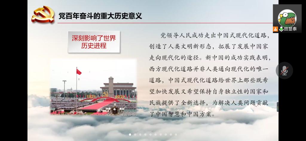 在学习中,大家首先学习了党的百年奋斗历程,一起领略党百年奋斗所取得的重大成就,紧接着,在主持人的引导下,大家又继续学习了“两个确立”、“十个坚持”的深刻含义,在新时代更好坚持和发展中国特色社会主义,具有重大现实意义和深远历史意义。学习结束后支部成员针对学习内容进行了线上分享讨论,成员们积极参与,热情度高,气氛活跃。