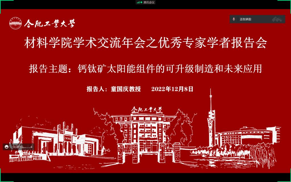 邀请了合肥工业大学黄山学者优秀青年人才计划主持人童国庆教授于12月8日在材料楼6楼601会议室做关于钙钛矿太阳能组件的可升级制造和未来应用报告会。