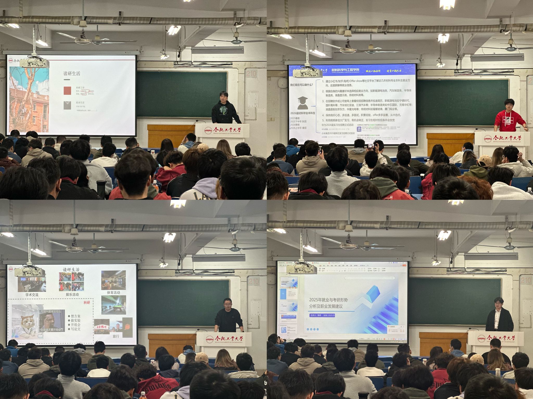 分享会上,由以推免、考研形式进入中国科学技术大学的亓亚刚、张岚鹏分享了3年的研究生生活实况,并围绕升学择校的申请策略、硕博选择的考虑因素、推免考研的经验方法、读研科研的能力要求等方面展开介绍。由入职合肥晶合集成电路股份有限公司工艺整合工程师岗位的刁怡辰和合肥中车轨道交通车辆有限公司市场运营岗位的鲁德,结合自身工作经历,介绍了材料专业可应聘的不同岗位的工作内容特点、能力要求、晋升通道,并就求职应聘、能力储备提出个人宝贵经验建议。